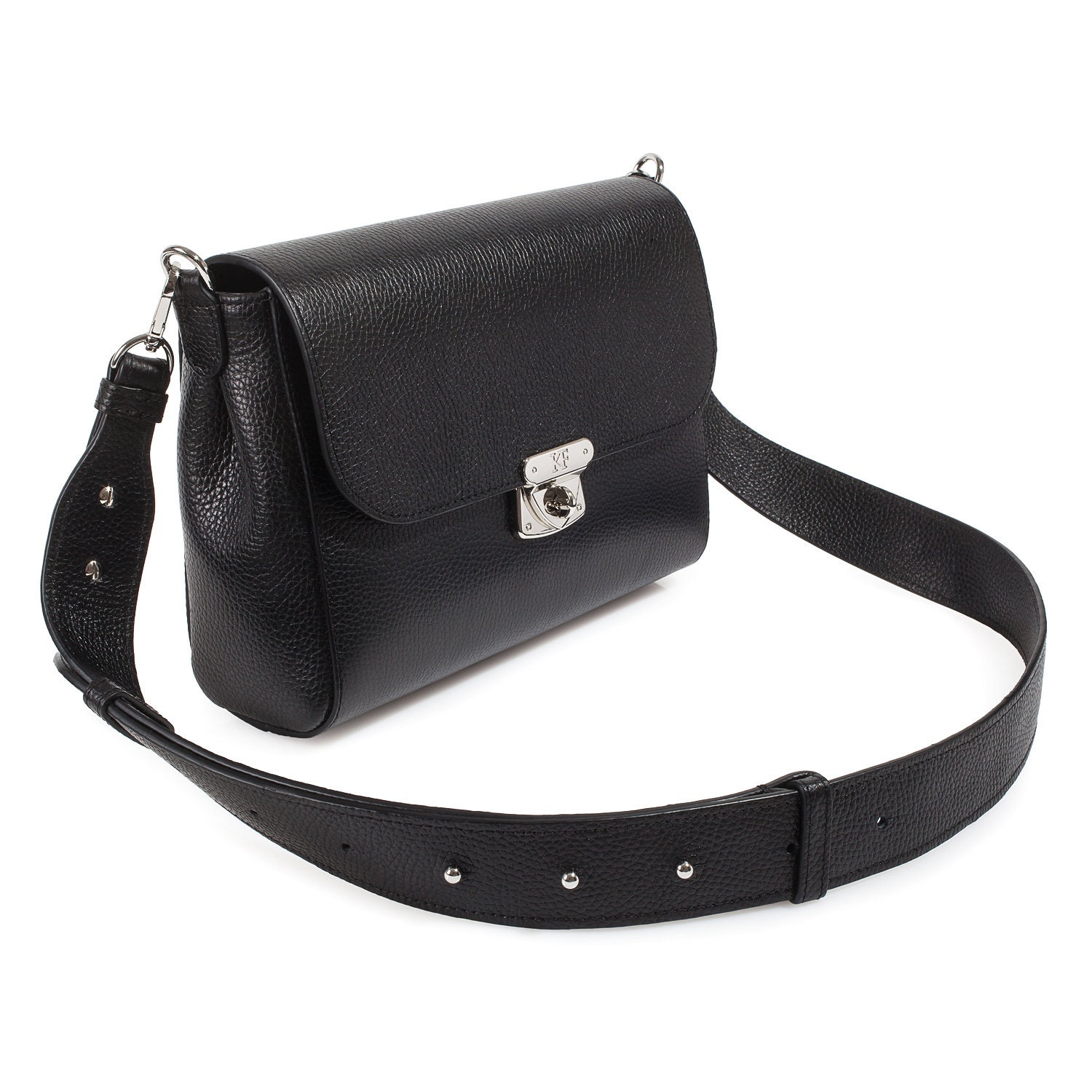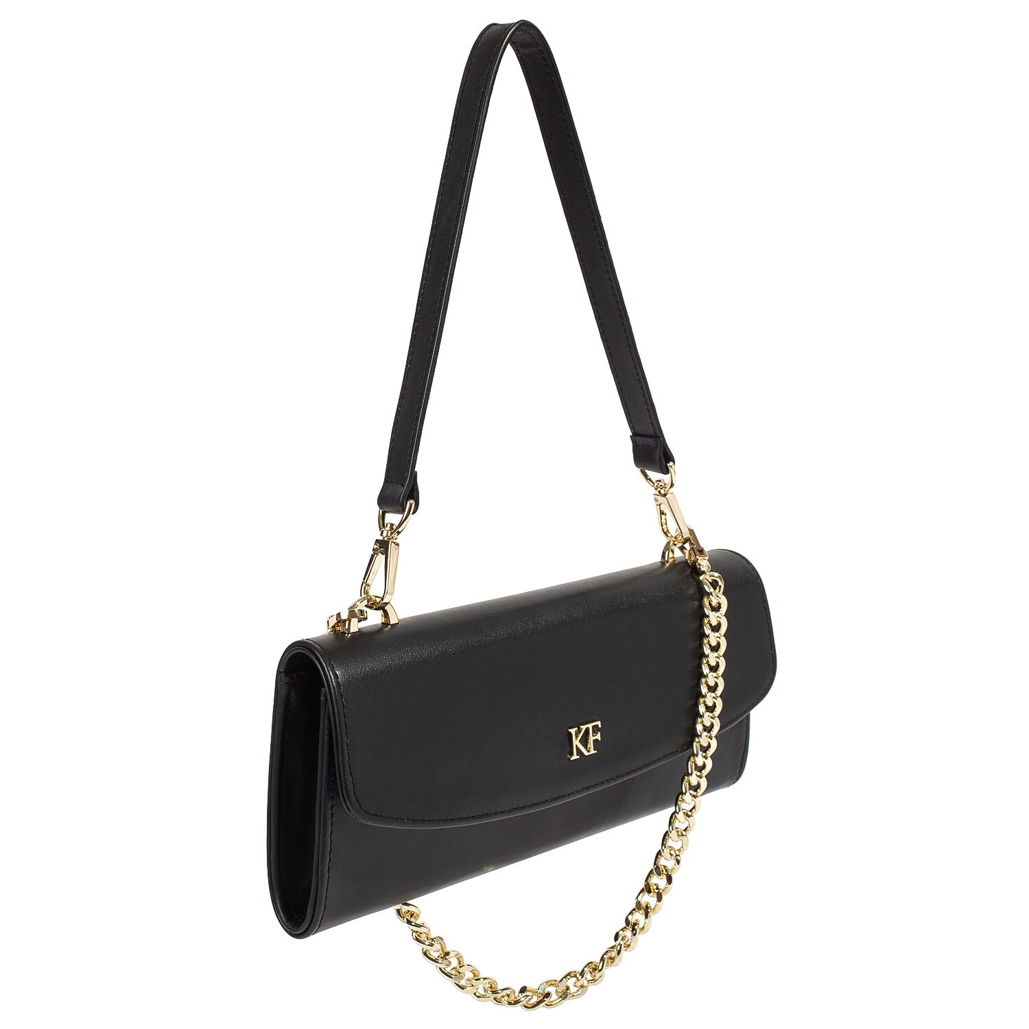 Black genuine leather woman shoulder bag from Ukrainian designer Katerina Fox. Fashionable and elegant modern bag KF for bright girls and women. This bag is able to attract attention and highlight your exquisite taste. Inside the bag is one compartment and a convenient zippered pocket for small items closes the bag on the button magnet. The bag is comfortable to wear on the shoulder or the wrist.
